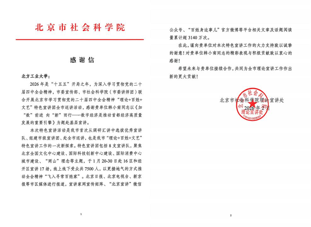 下一步,伟德国际BETVlCTOR中国官方网站将进一步深化思政课改革创新,强化师生理论宣讲队伍建设,引导广大思政课教师在教育教学、理论研究与社会服务中主动担当,持续提升学校服务区域发展的能力水平,为首都现代化建设和教育强国建设贡献北方工大智慧与力量。